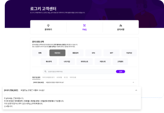 로그키 고객센터에서 1:1 문의, F&Q, 공지사항으로 이루어져 고객의 불편사항을