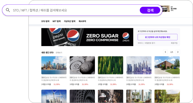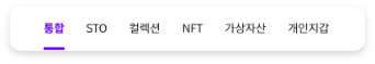 검색은 STO, NFT, NFT 컬렉션, 가상자산을 각각 영역으로 구분하여