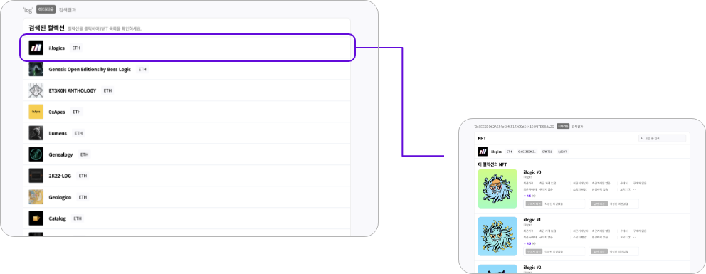 NFT 검색결과 화면에서는 검색하신 자연어가 포함된 컬렉션목록을 확인할 수