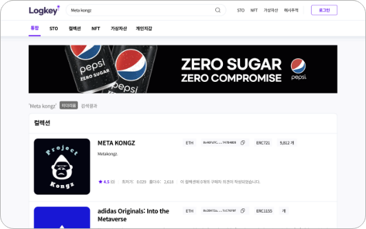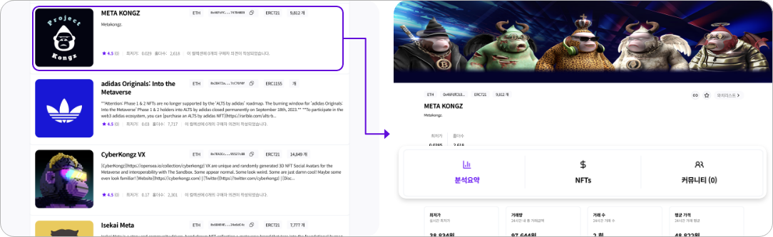예를 들어 NFT 컬렉션인 ‘METAKONGZ’를 검색할 시 해당 컬렉션은 물론,