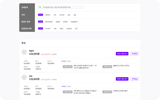 STO의 검색결과화면에서는 각 STO상품 정보를 확인할 수 있습니다.
